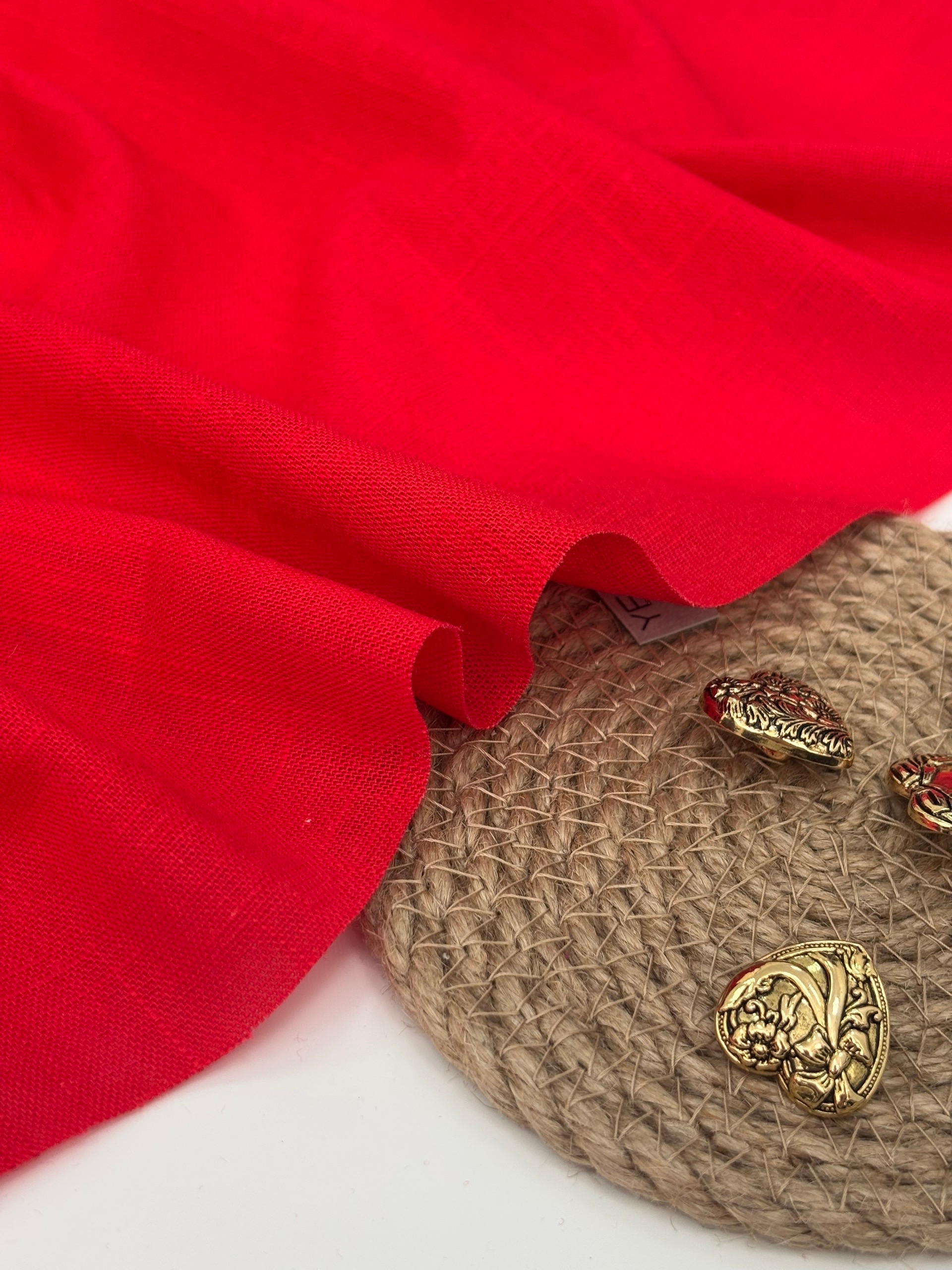 Лен с вискозой это смесовое полотно льна и вискозы. Структура полотна с выраженной фактурой льна, лицо и изнанка мало отличаются и выглядят практически одинаково. Лен немного мнется, вискоза все таки сглаживает и не ткани излишне смитнаться. Также за счет нежных и гладких волокон вискозы лен не колется, полотно становится более гладкое. Драпировка полотна плотная, складка получается объемная, без провисания, подходит для пошива изделий с объемными деталями: воланы, бантовые складки, рукава-фонарики итд. Срез осыпается, обработойте его на оверлоке и подогните или сделайте двойную подгибку, застрочив на прямострочной машине. Ткань немного просвечивает, но при использовании телесного белья, можно не делать подкладку, но в светлых оттенках подкладка все-таки понадобится. Лен с вискозой не тянется ни по ширине, ни по длине. Яркие и насыщенные оттенки обязательно притянут ваш взгляд и вы сразу придумаете, что же вы хотите сшить из этого уникального полотна. А сшить можно юбку, шорты, брюки, платья, косынки, рубашки, сарафаны, жакеты.