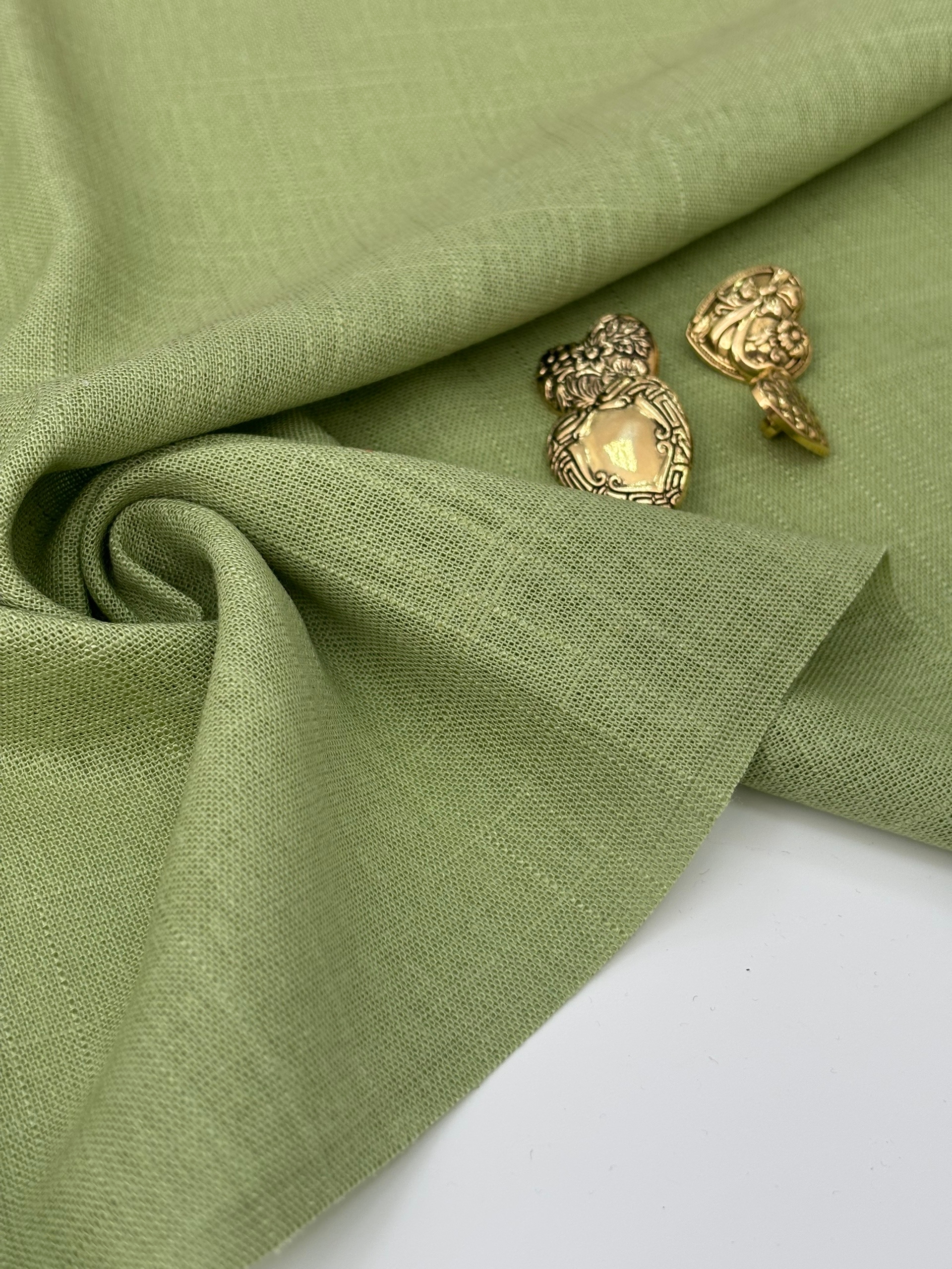 Лен с вискозой это смесовое полотно льна и вискозы. Структура полотна с выраженной фактурой льна, лицо и изнанка мало отличаются и выглядят практически одинаково. Лен немного мнется, вискоза все таки сглаживает и не ткани излишне смитнаться. Также за счет нежных и гладких волокон вискозы лен не колется, полотно становится более гладкое. Драпировка полотна плотная, складка получается объемная, без провисания, подходит для пошива изделий с объемными деталями: воланы, бантовые складки, рукава-фонарики итд. Срез осыпается, обработойте его на оверлоке и подогните или сделайте двойную подгибку, застрочив на прямострочной машине. Ткань немного просвечивает, но при использовании телесного белья, можно не делать подкладку, но в светлых оттенках подкладка все-таки понадобится. Лен с вискозой не тянется ни по ширине, ни по длине. Яркие и насыщенные оттенки обязательно притянут ваш взгляд и вы сразу придумаете, что же вы хотите сшить из этого уникального полотна. А сшить можно юбку, шорты, брюки, платья, косынки, рубашки, сарафаны, жакеты.