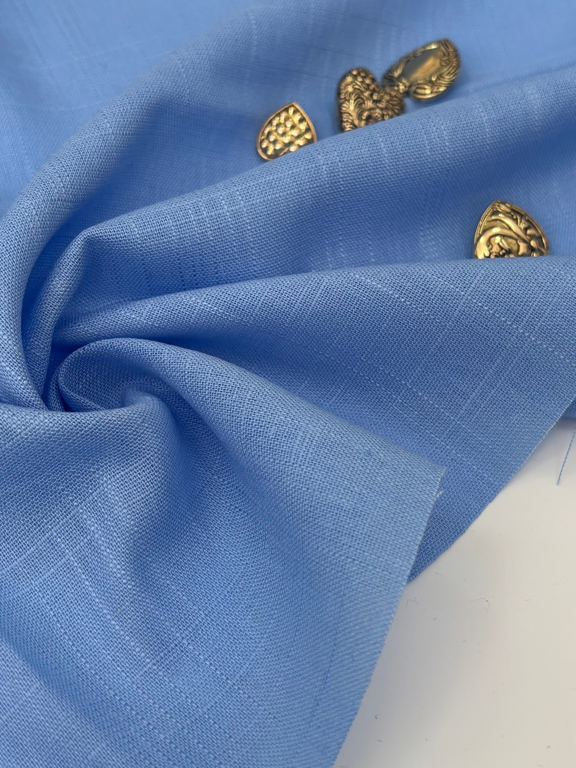 Лен с вискозой это смесовое полотно льна и вискозы. Структура полотна с выраженной фактурой льна, лицо и изнанка мало отличаются и выглядят практически одинаково. Лен немного мнется, вискоза все таки сглаживает и не ткани излишне смитнаться. Также за счет нежных и гладких волокон вискозы лен не колется, полотно становится более гладкое. Драпировка полотна плотная, складка получается объемная, без провисания, подходит для пошива изделий с объемными деталями: воланы, бантовые складки, рукава-фонарики итд. Срез осыпается, обработойте его на оверлоке и подогните или сделайте двойную подгибку, застрочив на прямострочной машине. Ткань немного просвечивает, но при использовании телесного белья, можно не делать подкладку, но в светлых оттенках подкладка все-таки понадобится. Лен с вискозой не тянется ни по ширине, ни по длине. Яркие и насыщенные оттенки обязательно притянут ваш взгляд и вы сразу придумаете, что же вы хотите сшить из этого уникального полотна. А сшить можно юбку, шорты, брюки, платья, косынки, рубашки, сарафаны, жакеты.